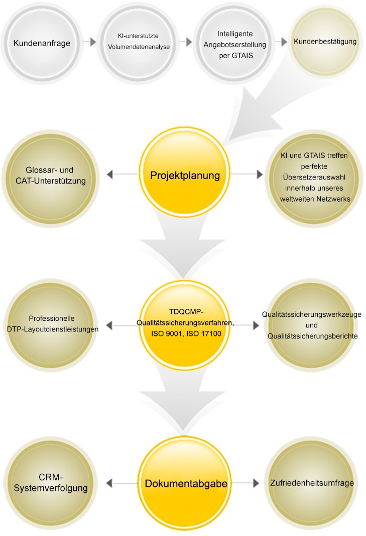 PTSGI verfügt über ein hochwertiges Standardarbeitsverfahren namens TDQCMP® (Translation Document Quality Control Management Procedure), das die nach ISO 17100 und ISO 9001 geforderten Standardverfahren erfüllt und übertrifft. Neben mehrfachen, manuellen Prüfungsschritten arbeiten wir auch mit QC-Software, um Genauigkeit und höhere Qualität zu gewährleisten.