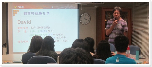 同學們欣賞PTSGI形象影片後,隨即由業務部陳協理介紹翻譯產業的概況、前景及職涯規劃…等主題。同學們才瞭解原來翻譯流程除了需要翻譯師外,還要各個部門的同仁協力配合。而每個部門的職務都需要具備相當的外語能力。陳協理也勉勵同學,外語能力是基本的條件,若能加強口說與聽的能力、培養興趣從中發展成專長,就能在職場上無往不利!