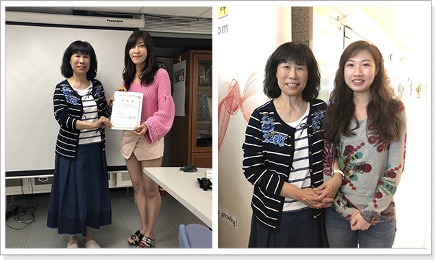 實踐大學胡淑娟老師贈PTSGI感謝狀。 | 實踐大學胡淑娟老師與PTSGI全球翻譯資源管理部專員合影。